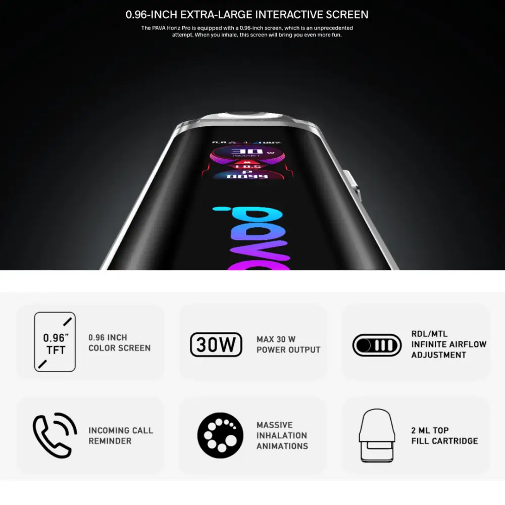 Le Pava Horiz Pro Pod Kit est un système de vape pod rechargeable conçu pour offrir à la fois style, polyvalence et technologie intuitive dans un format compact. Il convient aussi bien aux vapoteurs débutants qu’aux utilisateurs plus expérimentés.